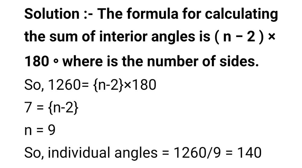 Plug in the number of sides and calculate now, divide by 16 to get the measure of one interior angle the number of sheets of paper available for making notebook is 75,000. Therefore the number of sides of the regular polygon is 8. As there are #8# interior angles each #135^o#. This is the currently selected item. Sum of interior angles = (n−2) × 180°. Remember, take the number of sides minus 2, and multiply by 180! Regular polygons exist without limit (theoretically), but as to find the measure of a single interior angle, then, you simply take that total for all the angles and divide it by. Another example the interior angles of a pentagon add up to 540°. A pentagon contains 3 triangles. The polygon has 60 sides. And we get to the originally stated formula. To find the number of sides given the central angle 6°: The interior angles of a polygon and the method for calculating their values.